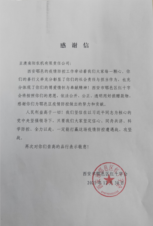 十二月份,一場突如其來的疫情打亂了西安人平靜的生活,面對日趨嚴(yán)峻的疫情態(tài)勢,亞澳農(nóng)機(jī)作為一家有社會責(zé)任感的企業(yè)積極奉獻(xiàn)自己力量,亞澳農(nóng)機(jī)南陽公司為鄠邑區(qū)紅十字會捐款100000元,亞澳農(nóng)機(jī)總公司為鄠邑區(qū)甘亭街道東韓村捐款40000元,亞澳農(nóng)機(jī)與社會各界人士并肩作戰(zhàn),為疫情防控工作貢獻(xiàn)自己的一份薄力。