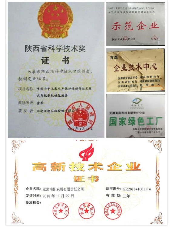 亞澳農(nóng)機堅持“產(chǎn)品就是人品、內(nèi)在是我心、外在是我臉”的品質(zhì)原則,多功能變速旋耕機、旋播施肥機、聯(lián)合耕整機、雙軸滅茬機、精量免耕播種機、深松機等產(chǎn)品在耕整機械(主機配套40-300馬力)領域處于行業(yè)前列, 累計取得自主專利78項。2018年“亞澳”商標獲得中國馳名商標,產(chǎn)品多次被中國農(nóng)機化協(xié)會、中國農(nóng)業(yè)機械流通協(xié)會、中國農(nóng)業(yè)機械工業(yè)協(xié)會授予“AAA級信用企業(yè)”、“技術進步獎”、“產(chǎn)品創(chuàng)新獎”、“全國農(nóng)機用戶滿意品牌”、“最具影響力品牌”,被國家相關部委單位授予農(nóng)業(yè)部科技進步三等獎、星火計劃金獎、西安市科技進步一等獎、陜西省行業(yè)之星企業(yè),“專精特新”中小企業(yè),南陽市級科技百強企業(yè)等多項殊榮;國家型高新技術企業(yè),在農(nóng)機行業(yè)中具有較高的美譽和知名度,得到了社會的廣泛認可。